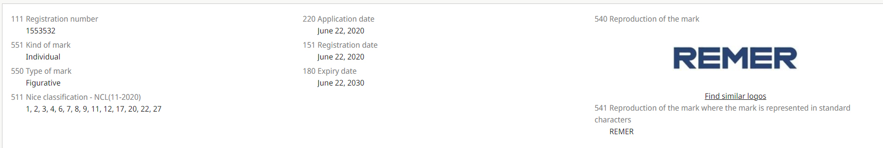 国际注册第1553532号“REMER”商标